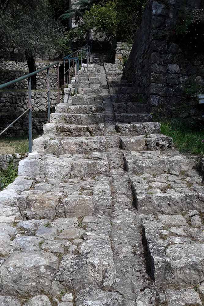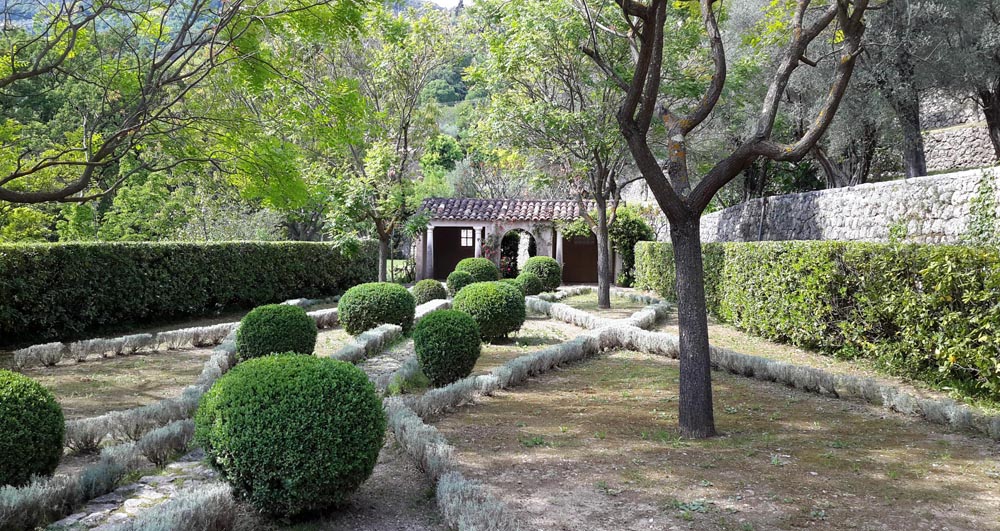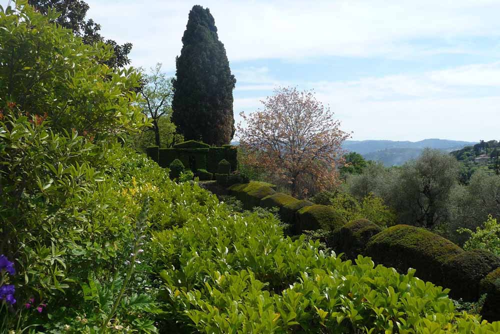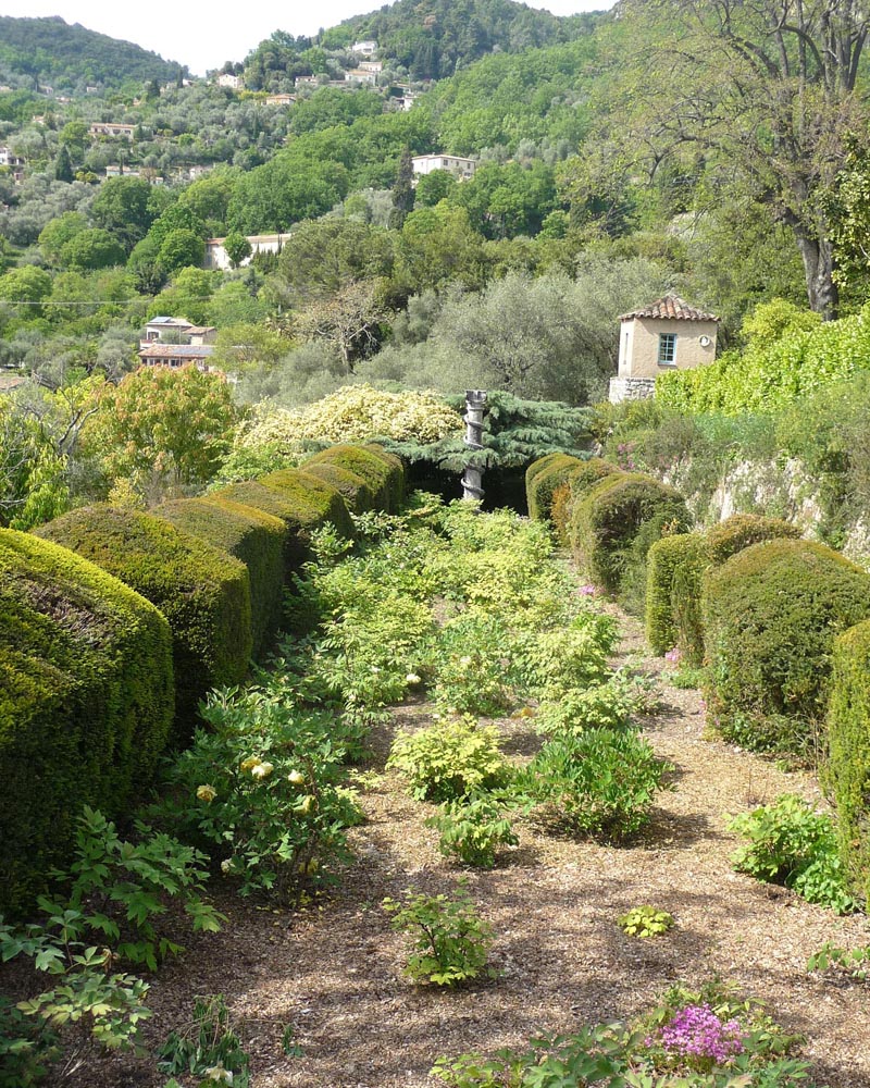 Villa Noailles is a classic garden of the Provencal arrière-pays, built on steep restanques, using the existing stone, keeping the colours subdued, so the whole remains part of the landscape, without a jarring note. In this garden, the very subtle greys of the original (and added) stones, merge with the different but never obtrusive greens of the plants. Although there are also brightly-coloured flowering plants, there is a fantastic richness and depth of colour given by the deep greys and mature greens. The garden is extensive (three hectares), as the photo of the ‘monumental staircase’ running nearly the entire drop from top to bottom shows. Subtle as it is, like Nicole de Vésian’s ‘La Louve’ in the Luberon, the garden shows the hand of a near-genius designer. On every level, the stonework, steps, wall recesses with statues, clipped hedges and box are really works of art. The views of the surrounding hills are a superb backdrop.