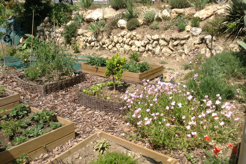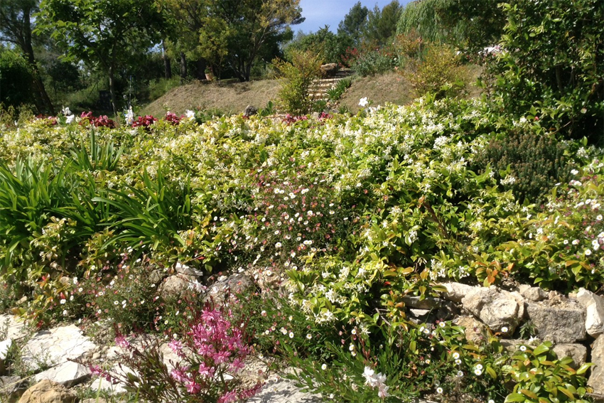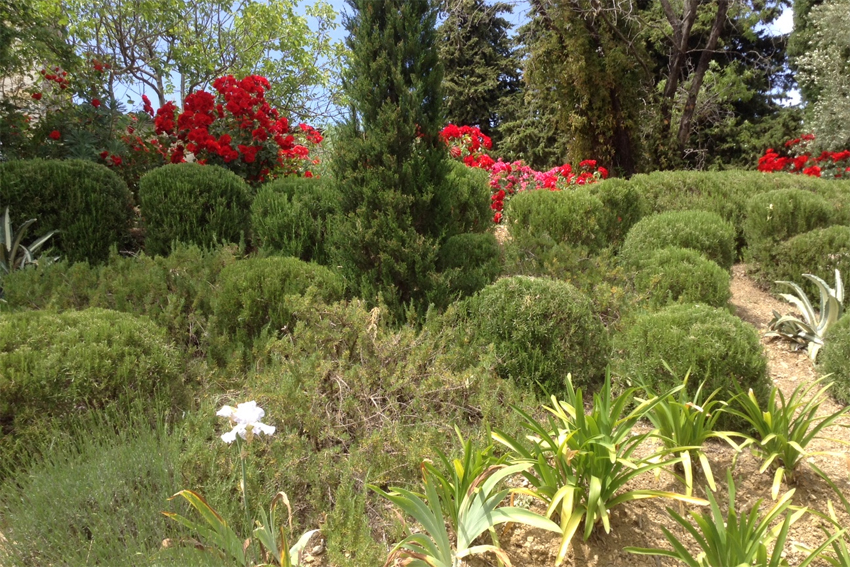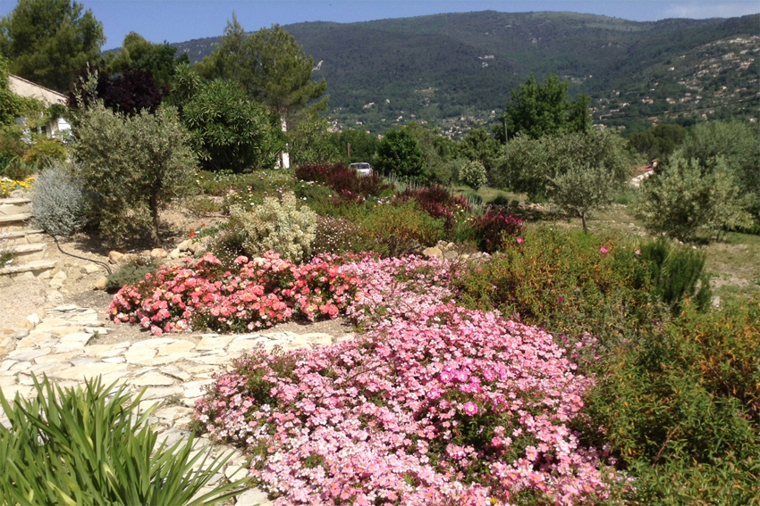 Lots of roses were bought from David Austin in the UK and delivered as bare roots plants. For these, holes half a metre wide and deep were dug and the roses then planted in ‘terreau’. With all year round watering, they were looking stunning, particularly since many were planted at eye and nose level to appreciate their beautiful colours and perfumes. Most other plants were bought at the English Garden Centre in Valbonne and again have survived well.