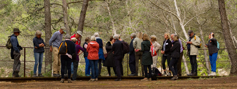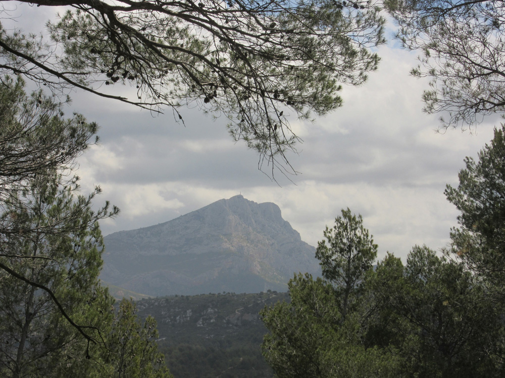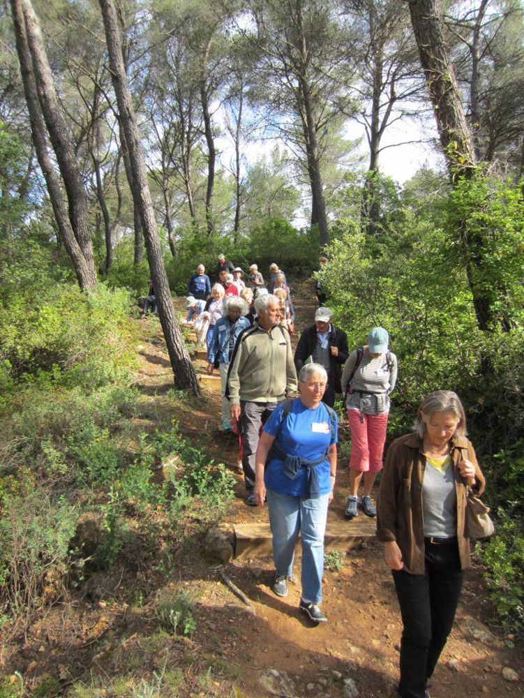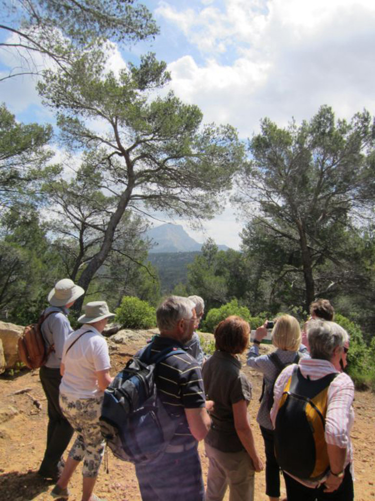 After the visit to the quarries at Bibémus the group found its way, along a serpentine hiking trail, to lunch in Le Tholonet, about 3 km to the south. The walk was first through a shady forest, then, emerging into bright sunshine, we stopped to look at the view of Montagne Sainte Victoire.