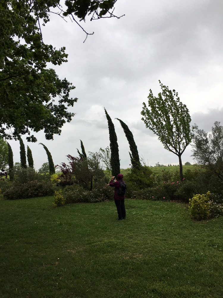 It was a wild and wet afternoon when we arrived at the 17th century bastide of Romégas and its garden. We were welcomed and told how the property had been restored over the last 40 years. The house lay down a very narrow lane with an even tighter entrance and driveway before the parking area on the old threshing floor, to the side of the buildings.