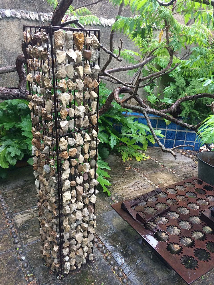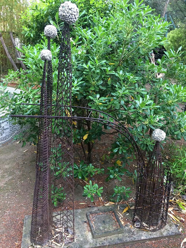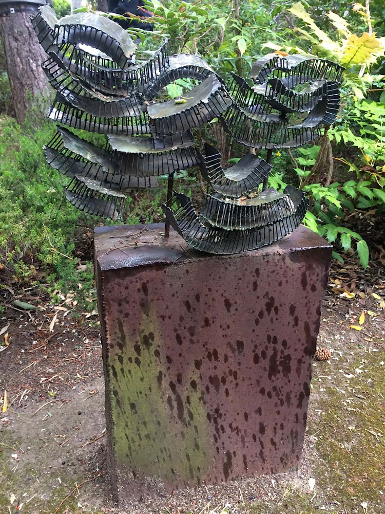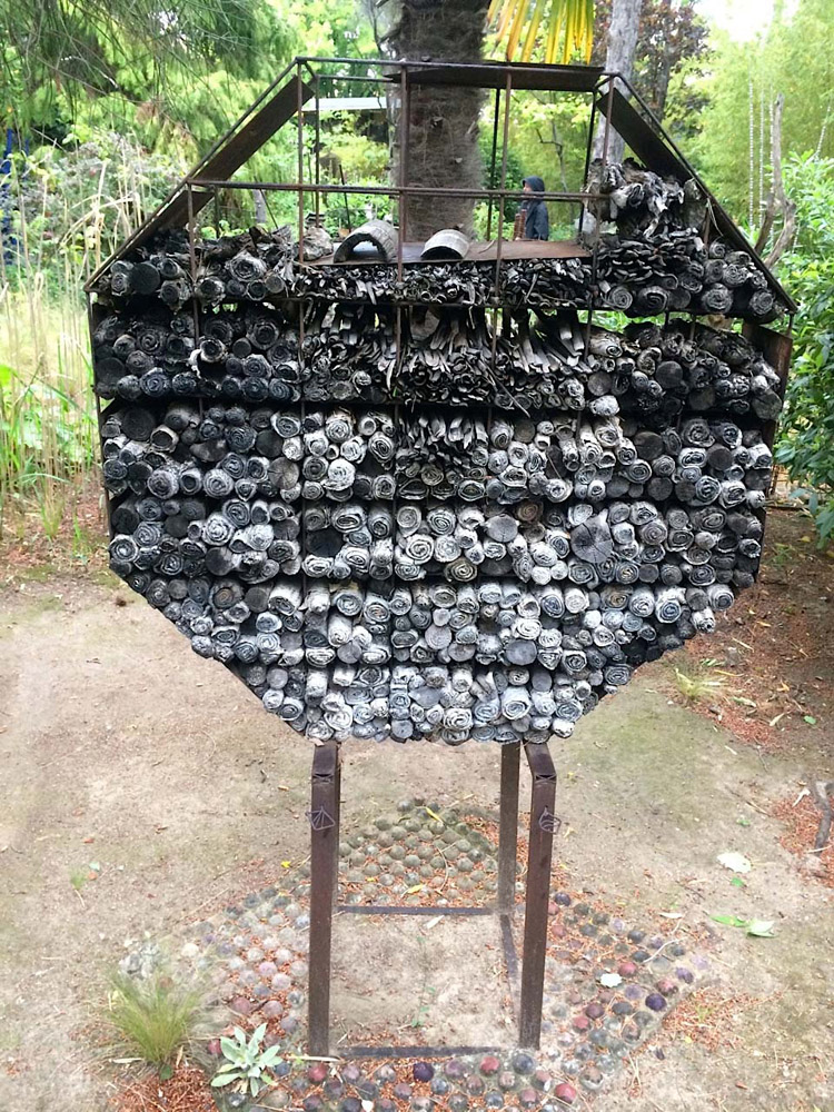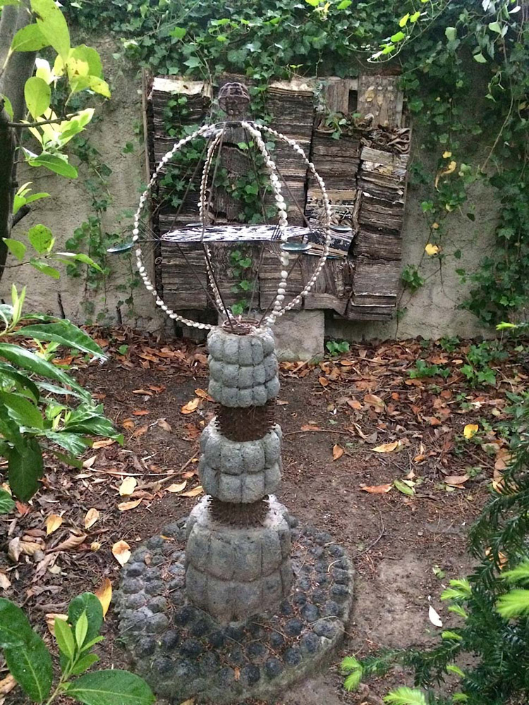 For over 60 years Max has been conceiving, designing and creating all kinds of shapes in a multiplicity of materials including metal, paper, plastic, snail shells, stone and wood. He has a total mastery of these materials and draws inspiration from nature, working on the multiplication of form from a simple base. Walking through Max’s garden is like being in a tiny universe both intimate and poetic. It is a feast for the eyes, where sculptures blend in with their back ground and at every turn one is both intrigued and delighted.