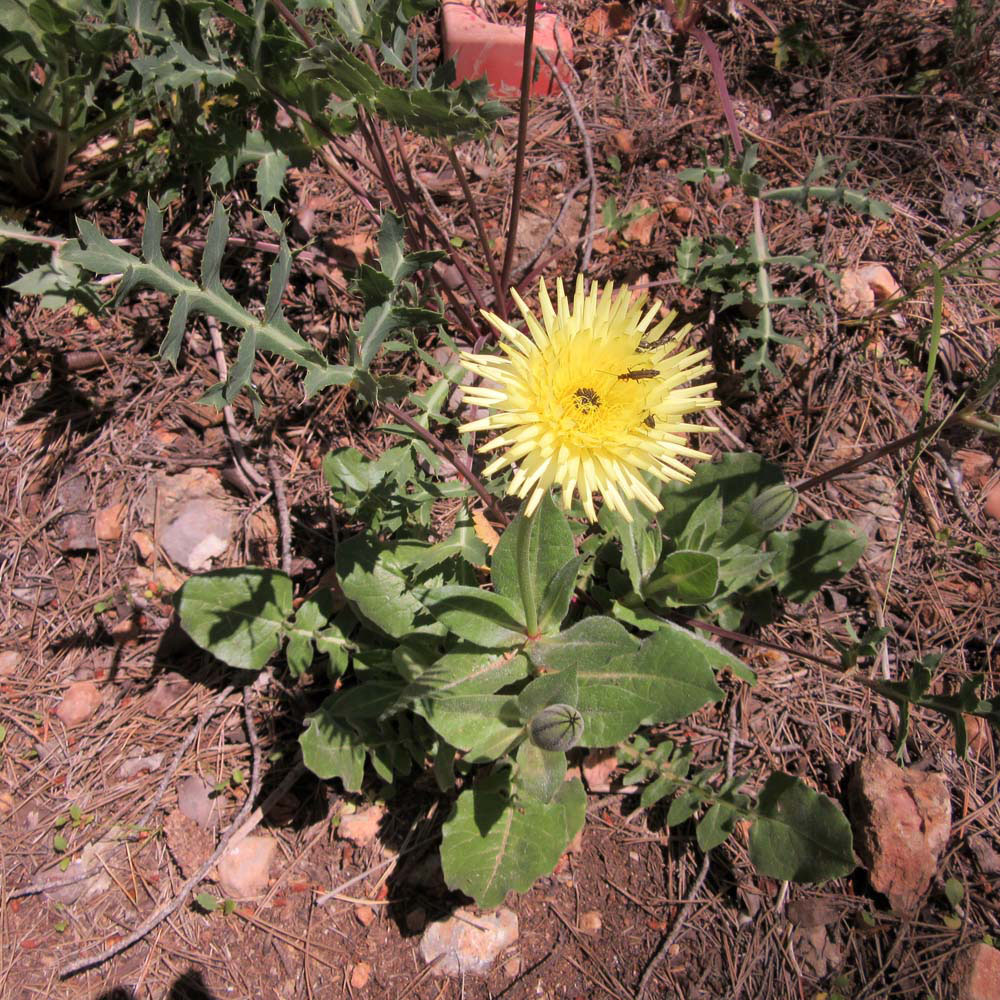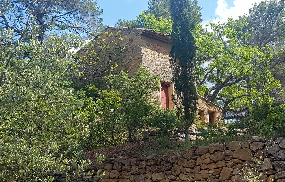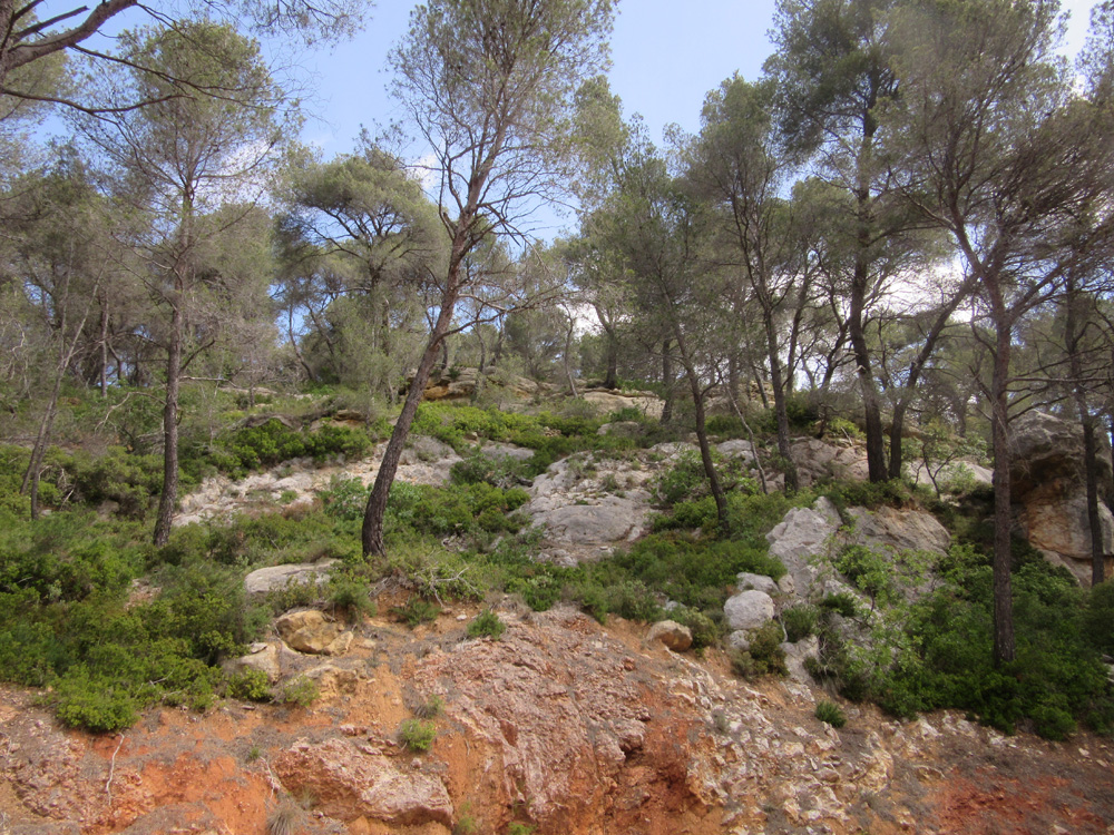 Our way continued, steeply downhill, on a path edged by banks of red soil and towering pin d’Alep trees (Pinus halepensis).