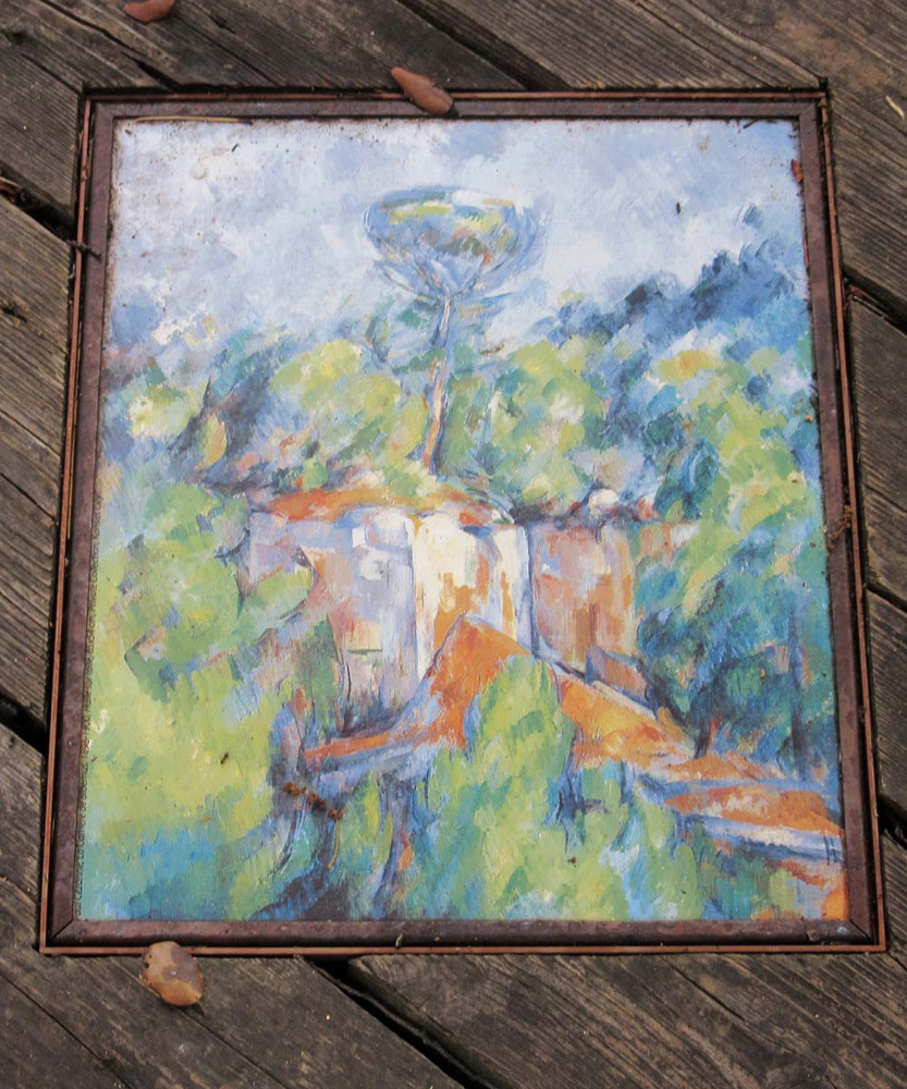 We climbed down into the quarry and along a rough path and turning a corner saw the last thing we expected – a car! A Canadian sculptor is the only person authorised to live in the quarry, in a small building with no services. Walking further, we came to the building where Cézanne worked from 1895 to 1899, and panels with reproductions of some of his famous paintings were placed at the very spots where he must have placed his canvas.
