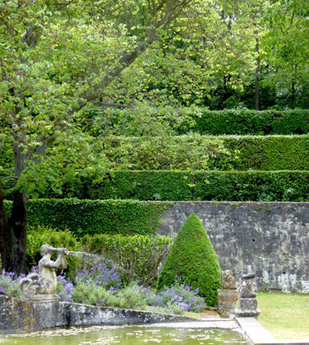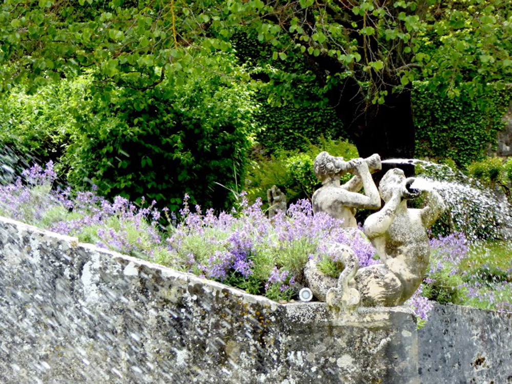 Beyond a wide sweep of lawn is the impressive bassin, containing exuberant sculptural fountains with 17 jets including tritons blowing water, flanked by symmetrical curving steps, santolina and sage.