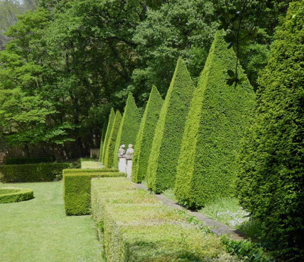 The highest terrace overlooking the whole garden is delineated by clipped pyramids of yew and a pair of stone sphinxes, welcoming the visitor into the more natural English garden where informal tree planting towers over a wildflower and longer grass carpet.