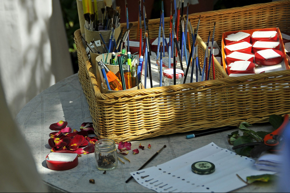Paintbrushes, and pollen in labeled boxes / Pinceaux et pollens en boites étiquetées