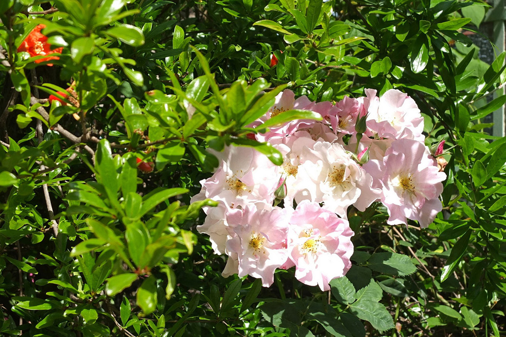 Les rosiers sont partout, autour de la maison et sur les terrasses, ne laissant que très peu de place aux autres plantes. Dominique Massad y a rassemblé les roses classiques qu’il aime et qui sont des valeurs sûres dans le Sud. Nous avons remarqué des grimpants comme : Rosa banksiae ‘Purezza’ à fleurs blanches non parfumées, en fin de floraison mais il refleurira en septembre, R. ‘Climbing Iceberg’, R.‘Climbing Cécile Brunner’. Egalement des rosiers buissons comme R. ‘Angela’, R. ‘Sally Holmes’, Rosa chinensis f. mutabilis et beaucoup d’autres.