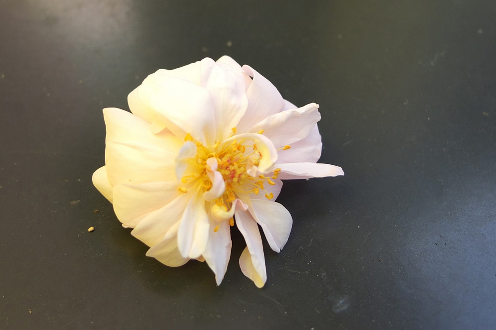 24h après, retirer le sachet et, à l’aide d’un pinceau à aquarelle de préférence en poils de poney, déposer le pollen du rosier-père (ici le rosier ‘Mamie Dittière’) sur les stigmates du rosier-mère. Lors du turpinage, les étamines du rosier-père auront été recueillies et conservées dans une boîte étanche à température ambiante, à l’ombre. En agitant délicatement la boîte, les étamines laissent échapper leur pollen qu’il suffit de recueillir avec le pinceau.
