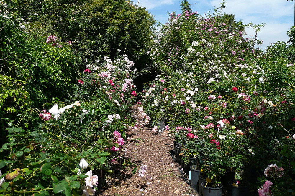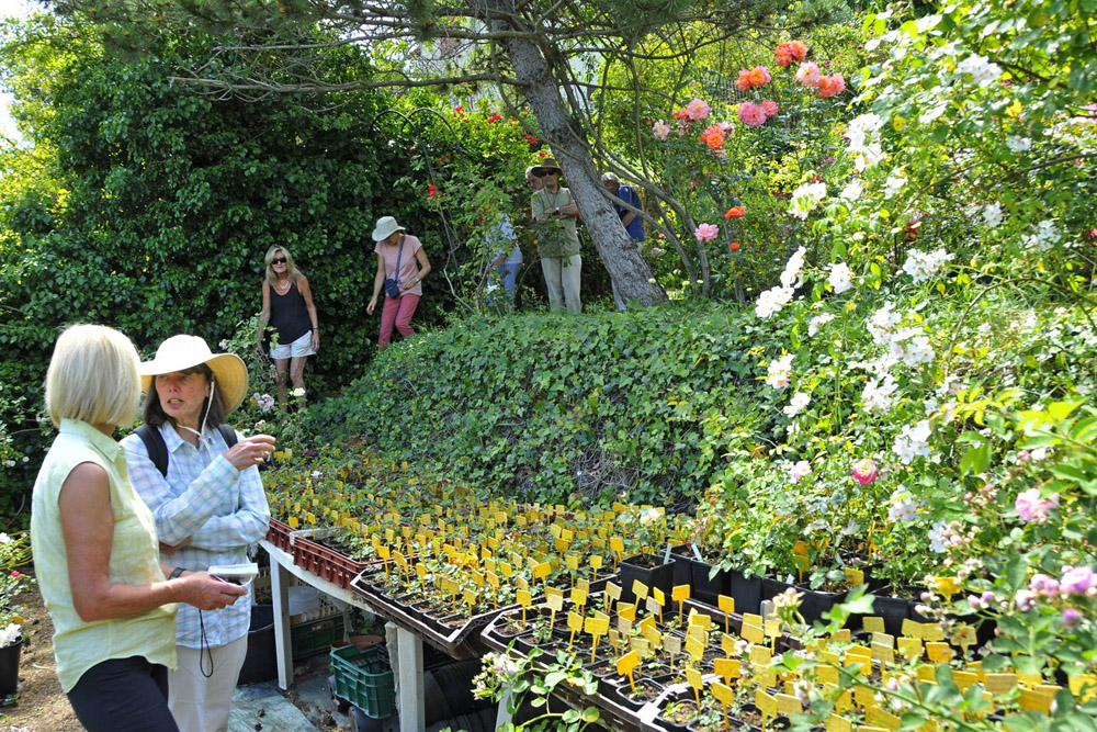 La visite se termine par les terrasses inférieures envahies par les jeunes rosiers en pot encore en observation et qui ne sont pas encore « baptisés ».
