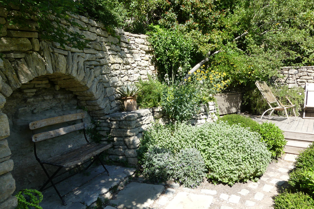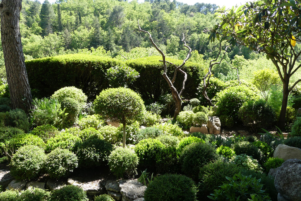The garden was created in the 1990s by Nicole de Vésian, a former fashion designer for Hermès who was fanatical about gardening in general and especially about what has come to be known as the provençal style of gardening. She worked hard for 10 years to create a complex, refined and very personal work of art: a collection of terraces, living spaces and quiet corners for contemplation where stone, wood and clipped Mediterranean evergreen and silvery plants harmonise with, and blend subtly into, the surrounding countryside. In her early 80s she sold the property to Judith Pillsbury who in turn worked hard to keep the living work of art, which was already a famous garden, alive. In 2014 Sylvie and Pascal Verger took over. They are committed to preserving Nicole’s garden, extending and renewing it as necessary whilst maintaining the spirit of its creator and taking into account the climatic and water constraints of Provence.