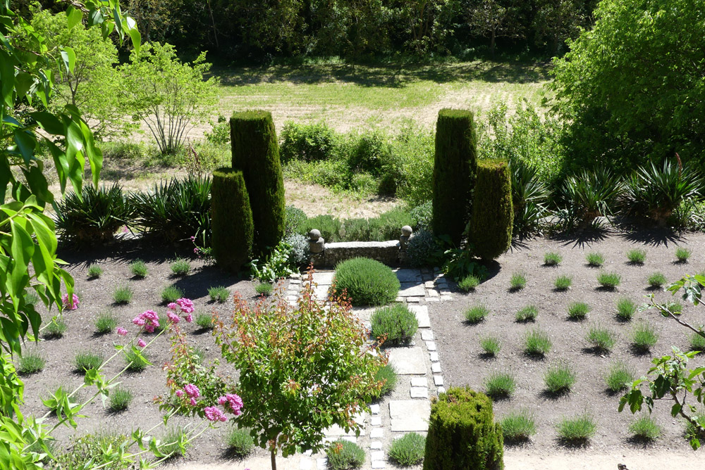 The lavender field, situated on the lowest level, has recently been replanted. Here again, the space was designed to allow one’s gaze to wander far over the wooded countryside.