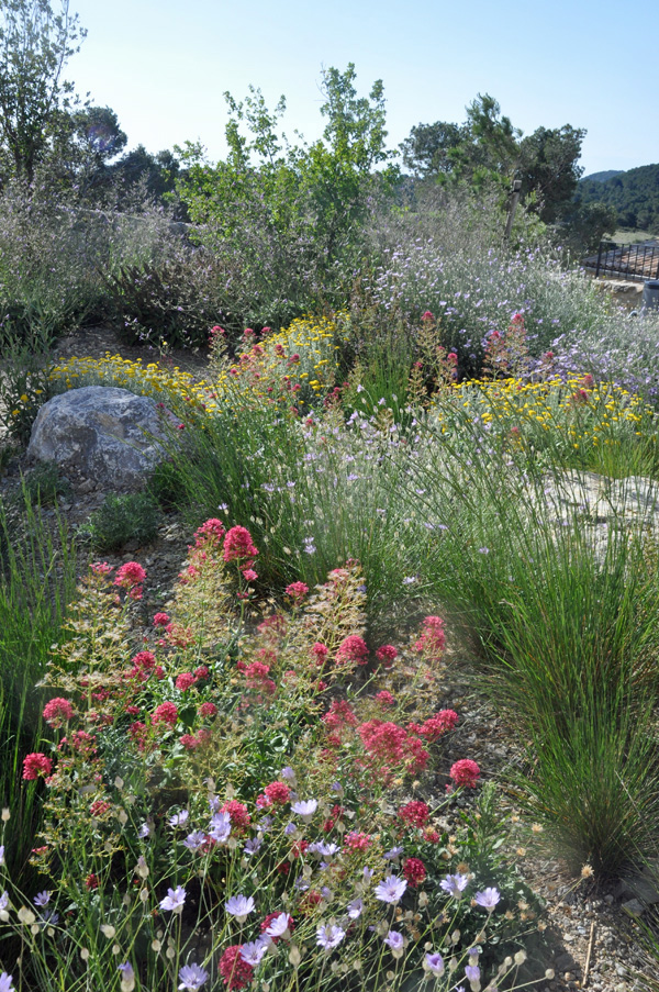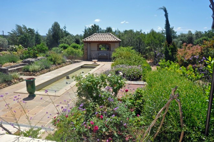 Cependant, phlomis, cistes, vitex et de nombreuses autres plantes ont survécu et vivent bien. Le jardin est centré par un bassin d’esprit andalou qui lui amène du caractère.