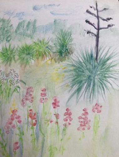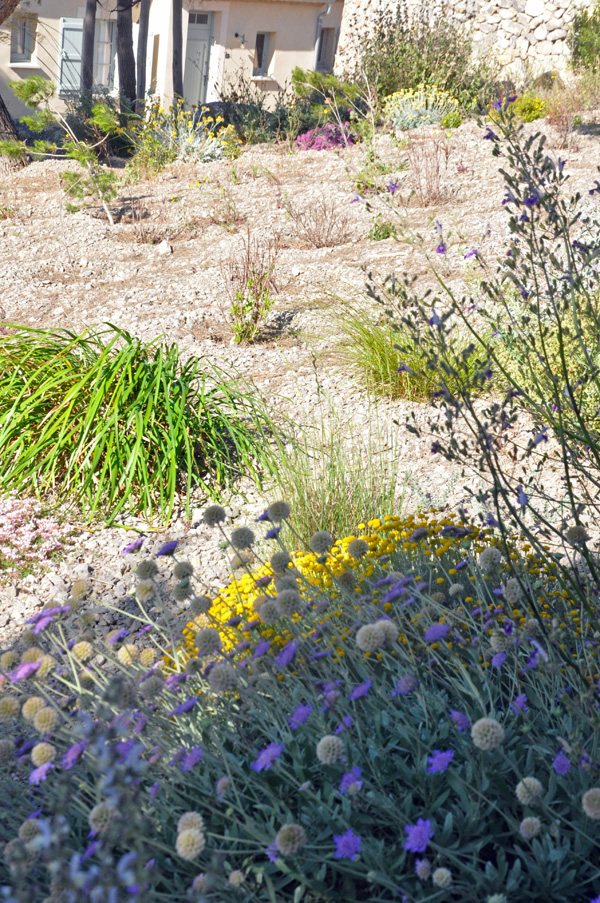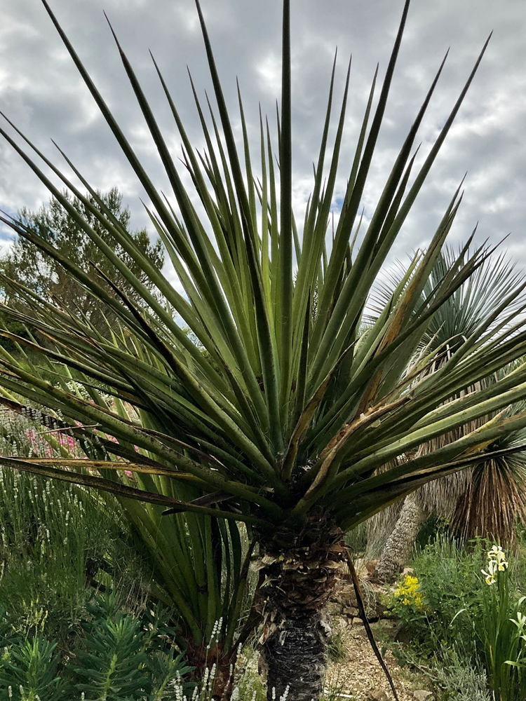 On descend lentement en suivant un labyrinthe d’étroits sentiers. Des graminées, bercées par le vent nous accompagnent. Entre les taches de fleurs, dominent des yuccas, des agaves, des beschornérias, des nolinas souvent en fleurs.