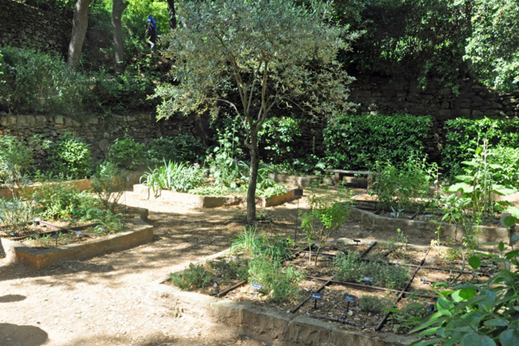 Chaque terrasse montre un art et une pratique différente du jardin selon l’époque avec des types de plantes correspondant à chaque période : plantes sauvages au Moyen-âge ou plantes d’autres continents importés à la Renaissance par exemple. Nous avons ainsi déambulé dans un sous-bois méditerranéen pour découvrir le jardin des abeilles, l’Hortus conclusus, jardin enclos monastique du Moyen-Âge avec sa structure en croix centrée par un olivier.