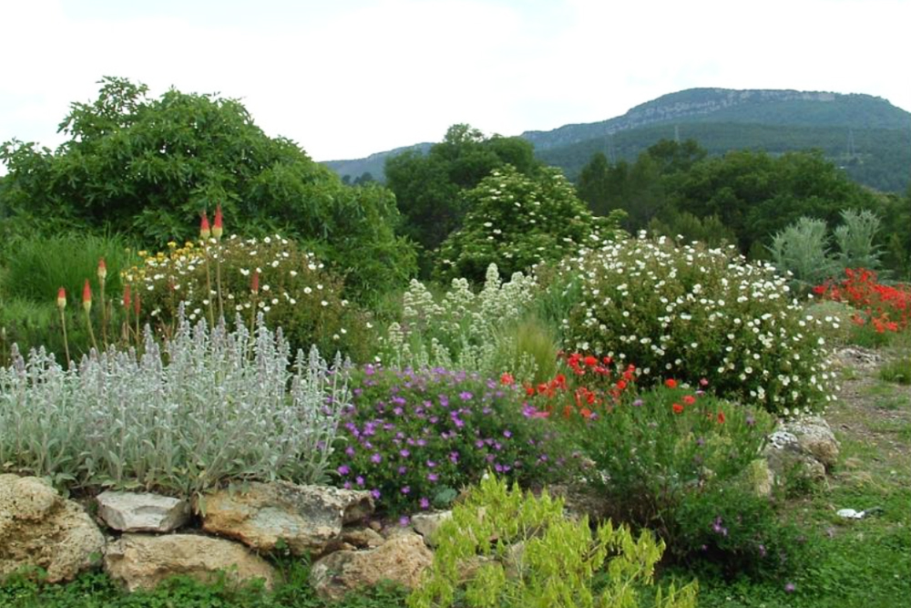 Arbustes à fleurs, plantes de Provence (romarin, lavande, thym…), plantes couvre-sols et une collection de cistes.