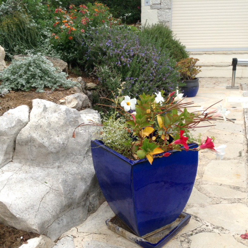 Extensive use of Pittosporum sp. gave shape to the beds around the house and a green framework for the long-flowering Rosa mutabilis chinensis, plumbago, white yucca and Erigeron karvinskianus. A plant pot introduced a splash of bright blue.