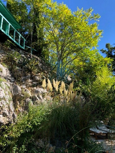 On a beautiful sunny Friday in October, we visited the garden at Le Vallon du Brec, a jardin remarquable situated in the hinterland of Nice at a height of 1000 metres. The garden was created in 1992 by a painter and photographer who used Japanese influences to enhance the steeply wooded site overlooking a small valley. When they moved, the garden suffered a period of neglect, however now new owners have breathed life back into the space and enhanced it with their own ideas. The garden contains plants from China, Japan and North America as well as indigenous ones. There are red-painted wooden structures, redolent of Japan, comprising staircases, platforms and arches, and a more Persian-looking turquoise pavilion overlooking a tranquil fish pond and swimming pool. The turquoise colour of the pavilion is echoed in the oil-painted tree trunks, which also greet one at the entrance to the garden.