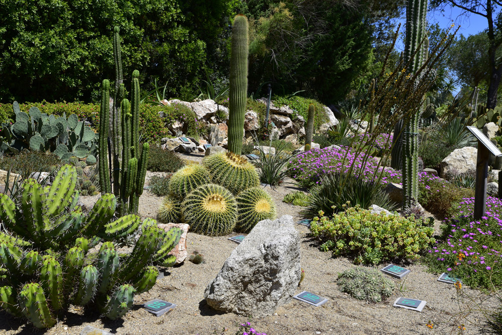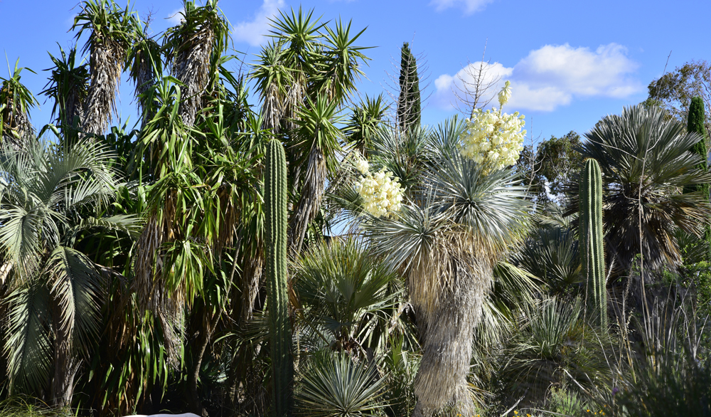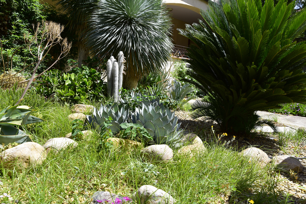 Une grande rocaille rassemble des plantes au feuillage gris-bleu avec des grands yuccas, agaves, aloes, nolinas, xanthorrhoeas, cactées.