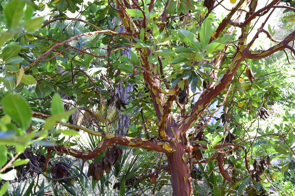 Un énorme et spectaculaire belombra ou Phytolacca dioica présente un tronc à la base très large qui lui donne une allure de bonsaï géant. Des palmiers, entre autres, Brahea armata, Livistona chinensis…