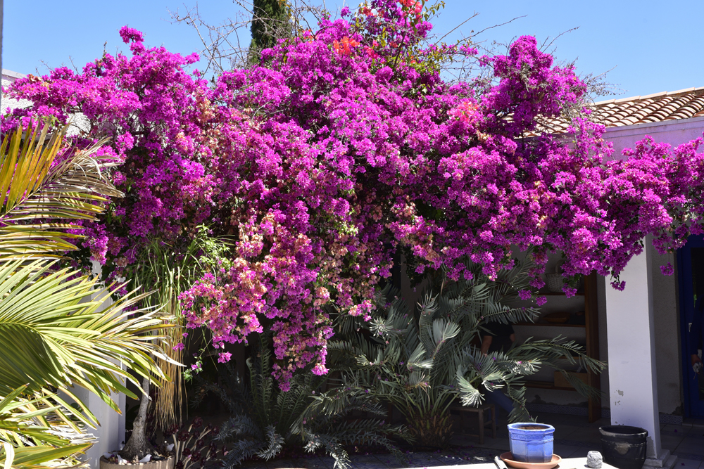 The afternoon was devoted to a visit to the garden, home to a host of exotic species that are original and beautiful all year round. Pierre has been acclimatising them since 1993, taking great care to ensure that they are hardy in this highly favoured Mediterranean area. There is so much to see! When we arrived, we noticed the Arbutus canariensis, at the point of changing its bark, and two large Aloe marlothii, over two metres high. A large bougainvillea with bright purple bracts decorates the patio.
