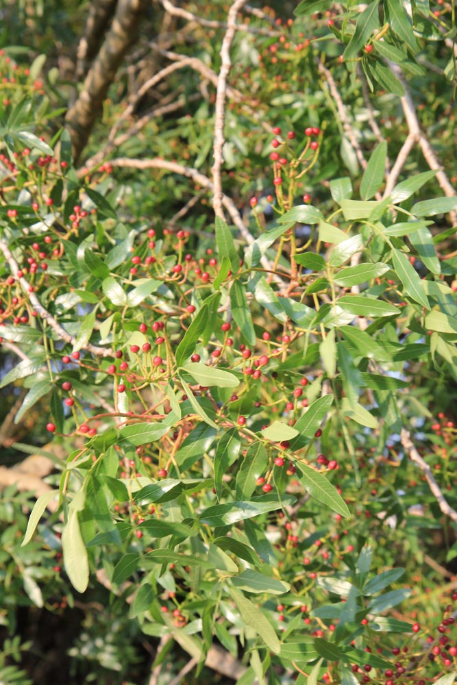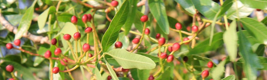 With age, P. atlantica can reach heights of over 10m (in Morocco, 20m for several hundred-year-old trees). This small tree with a short trunk has a regular, rounded crown supported by a dense branching system. The composite leaves are imparipinnate (often 5 to 11 leaflets), dark green and lanceolate, sometimes bearing red galls. The flowers, grouped in elongated panicles, are yellowish for the male flowers and reddish for the female flowers. The red, spherical fruits are around 6mm in diameter.