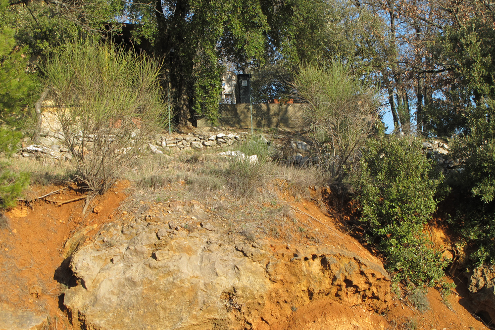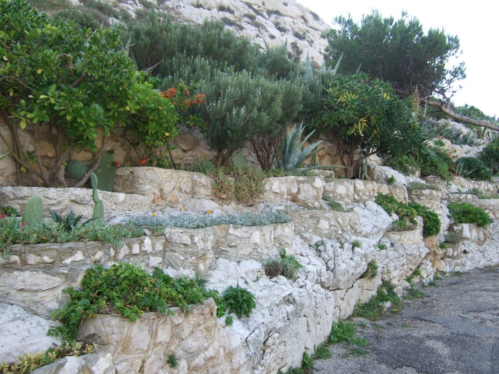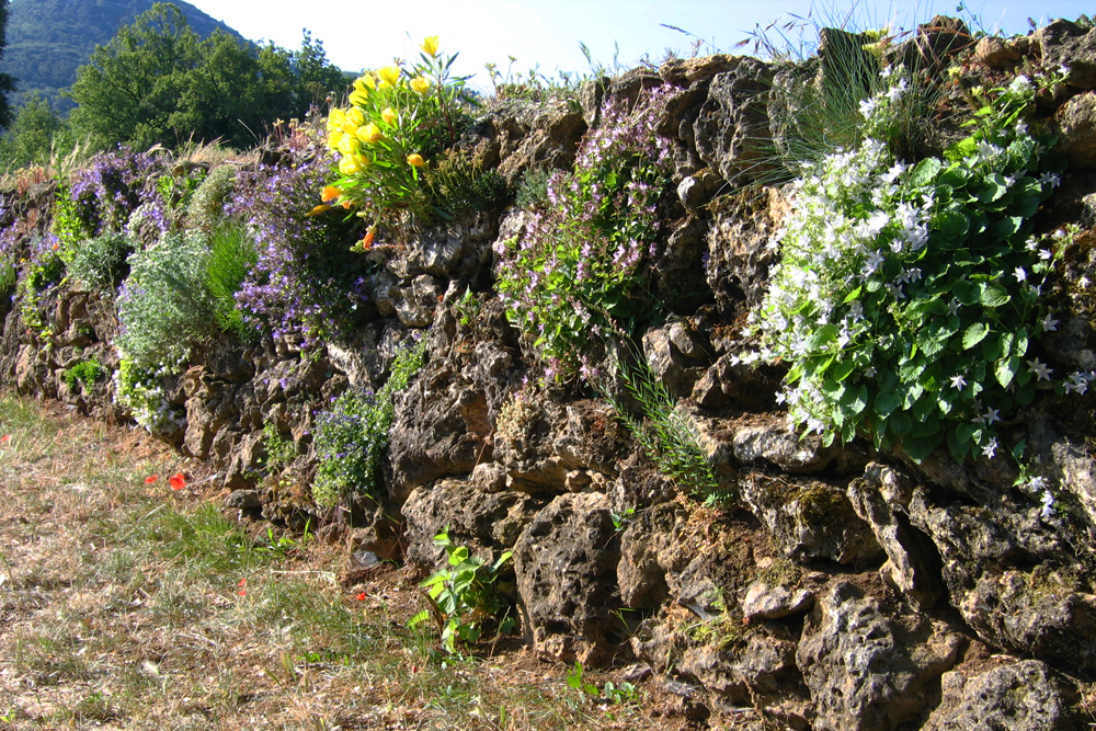 A widespread difficult situation is the steep bank, usually in full sun, providing both hot and dry conditions. He suggested deep planting pockets, protected all round by stones to aid watering. Steep banks often have heavy, compressed lime soils (marne) which suffocate plant roots. Here the only real solution is to identify clay-tolerant plants such as Catananche sp., which will adapt to these conditions.