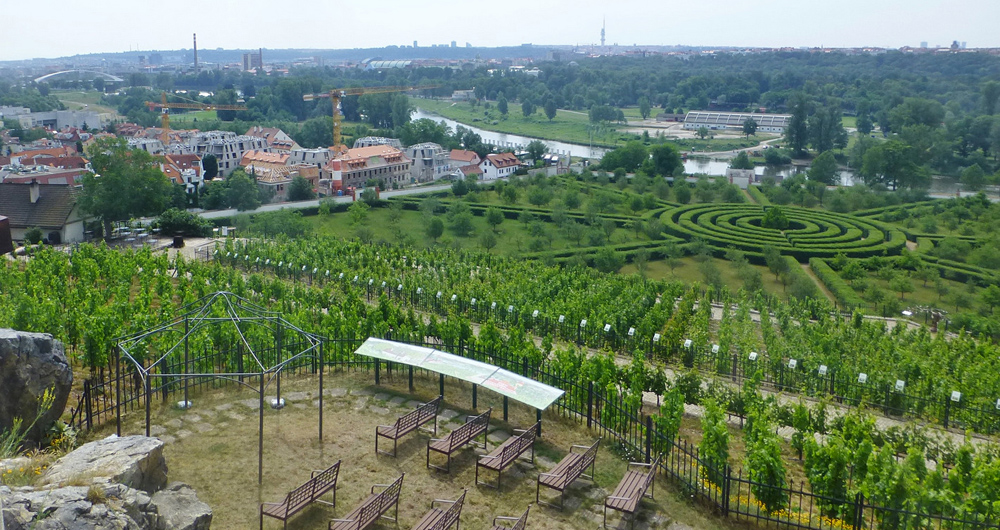 Le vignoble historique reconstitué de Sainte Claire entoure le château de Troja.