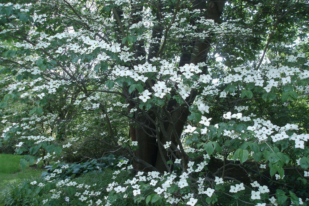 The delightful Japanese garden, with its collection of maples and other Japanese trees, has been set out according to symbolic principles on an extensive and undulating site. Only Cornus kousa was in bloom when we visited the garden.