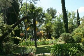 On May 4th we visited Denis Weis’s “Chemin de Ronde” garden in Figanière. Denis’s garden, named after a tour of the ramparts, was designed, as the name suggests, to lead one round the garden and to confuse one about its size – which it did, being crammed with a multitude of lovely and unusual plants. The visitor is greeted at the front gate by a Vitex agnus-castus (unfortunately too early for its lovely blue flowers) and then welcomed into the garden by perfumed roses (Rosa ‘Papa Delbard’, R. ‘Jacques Cartier’, R. ‘Celestial’ and R. canina). Entering the shady side of the house, where ferns flourished with shrubs, roses and trees including a white Cercis (from Pierre Cuche) overhanging the path, we were led through to a small lawn with hebe and pittosporum and hence to a Japanese area with bonsais. From here a bamboo tunnel led to a pond and thence to the potager and fruit garden back at the front of the house.