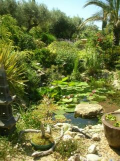 Later in the still very hot afternoon, we convened at La Campagne Sainte Marie, the garden of Nicole Rengade in Tourettes near Fayence. The 5000-square metre garden which the Rengades acquired in 1995 surrounds a 200-year-old farmhouse whose façade is covered by vines and wisteria. Nicole has single-handedly created a wonderful garden. Decorating it with spare roof tiles inscribed with poems, she uses old casseroles as pots for geraniums and sedums. This very individual garden has a stream leading to an old lavoir, 800 varieties of plants and three Provençal donkeys. There’s also a good nursery attached to the domaine run by her son-in-law. After we had wandered round the garden, Nicole generously treated us to some cold drinks including delicious home-made orange or lemon wine which revived us enough to drive home.