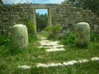 On Tuesday 16th June we visited the Mas des Mauriers, Michelle and Guy Beddington’s garden which is situated at one end of the interlocking group of valleys dominated by the village of Bargemon. The welcoming stone house was originally created from a barn and various outhouses by the previous owners but was enlarged and enhanced by Guy and Michelle. They have added a beautiful pool of dark green stone and planted the courtyard garden around it. Outside this partly enclosed space, Guy and Michelle are gradually clearing the undergrowth of an overgrown olive grove to create an open-air gallery for a number of intriguing installations by the Surinamese artist Marcel Pinas and beautiful, very large glazed pots by the German artist Peter Thumm.