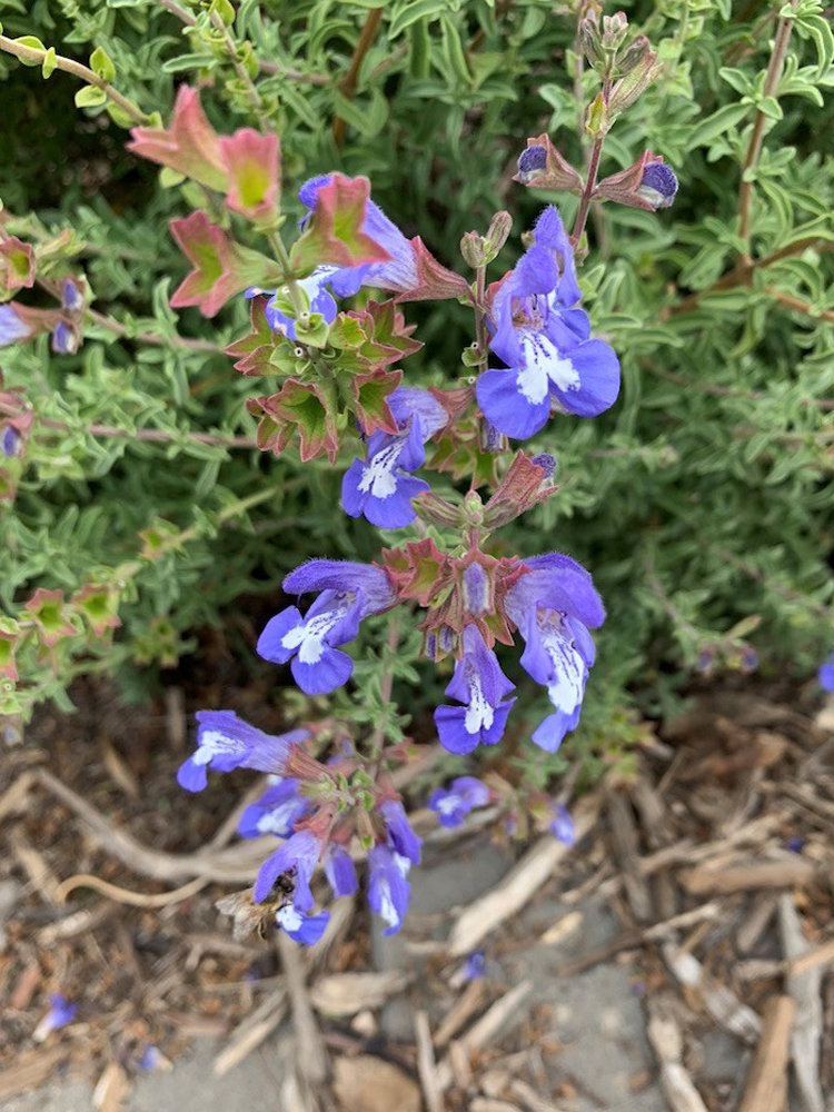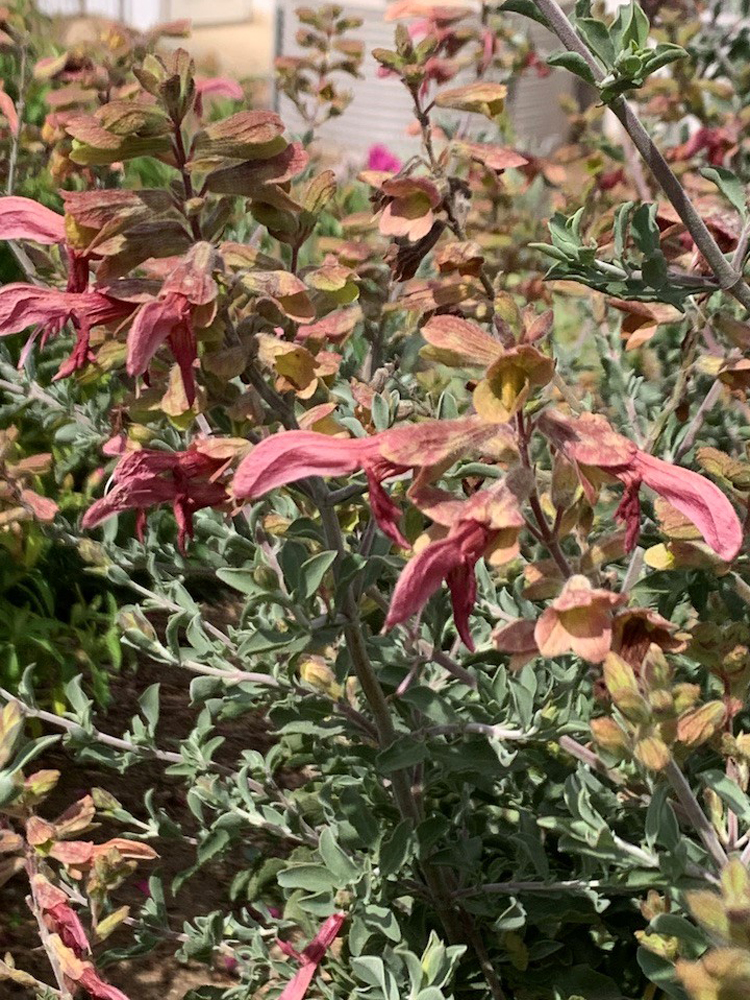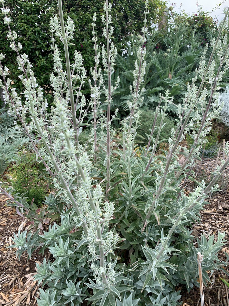 C’est une sauge californienne aux grandes feuilles argentées. La plante atteint environ un mètre ou plus et les branches couvertes de petites fleurs blanches s’élèvent au-dessus du feuillage au printemps. Lorsque vous le frottez, le feuillage dégage une forte odeur aromatique. Le sol doit être bien drainé. Mes plantes semblent insensibles à la chaleur estivale.