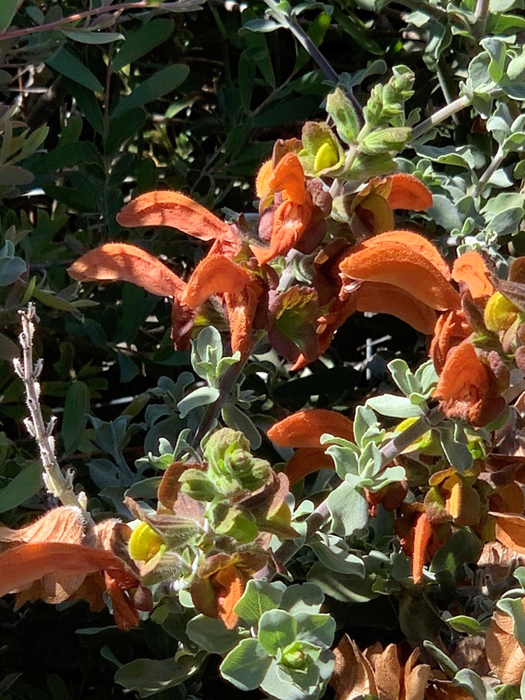 Cette plante est connue depuis de nombreuses années sous le nom de S. africana-lutea. C’est un arbuste à feuillage persistant, vert grisâtre, atteignant un mètre et demi. Les fleurs varient d’orange à rouille et apparaissent toute l’année. Elles se ternissent sur la plante, en conservant leur forme et virant au brun clair, ce qui donne de l’intérêt à la plante en toutes saisons. Elle résiste aux vents forts et aux embruns. J’ai trouvé qu’elle était un peu filou, sauf si vous gardez un œil dessus car elle se ressème. Il paraît que les feuilles font un thé agréable même si je ne l’ai jamais essayé !