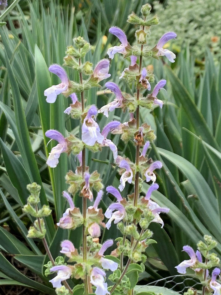 This is a Californian salvia with large silvery leaves. The plant grows to about a metre or more, and the branches of small white flowers rise above the foliage in the spring. When you brush against it, the leaves release a strong aromatic scent. The soil should be well drained. My plants seem impervious to summer heat.