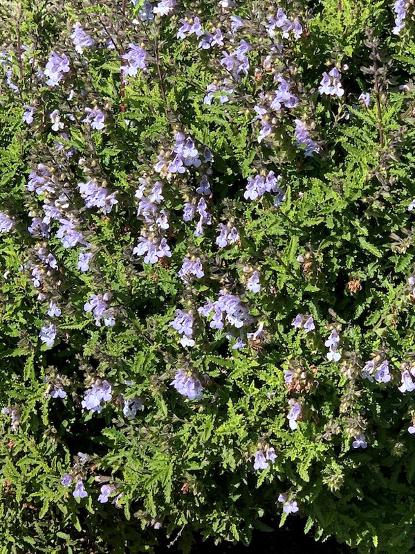 A very pretty tough salvia that grows naturally into a round cushion shaped bush. A little light pruning every so often keeps it compact. Its little blue flowers cover the plant throughout the summer. It has tiny olive green leaves.