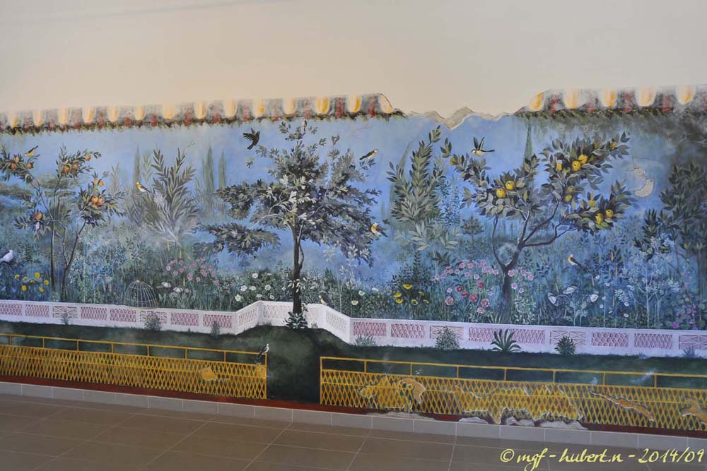 Cette reproduction présente un jardin sur une fresque qui ornait la salle à manger d’une maison à Rome. Nous y voyons un jardin idéal, l’image d’un paradis entre nature et culture, un lieu où la nature vient au contact de la civilisation.