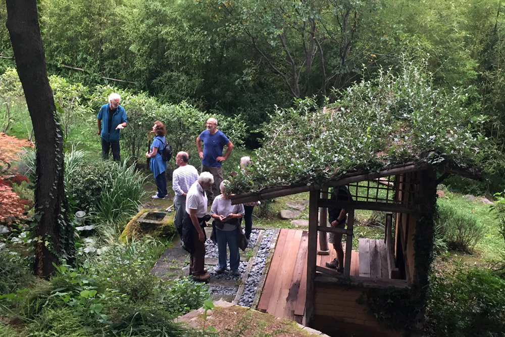 Des sentiers mènent à travers le bois à un magnifique jardin japonais, conçu par Erik Borja, comprenant un charmant coin salon avec un toit vert vivant.
