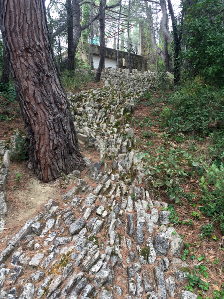 Further on we discovered Idoux’s Rivière de Pierres which flows down from a square pergola into a grotto where the three major religions of the world are symbolically celebrated in sculptural form.