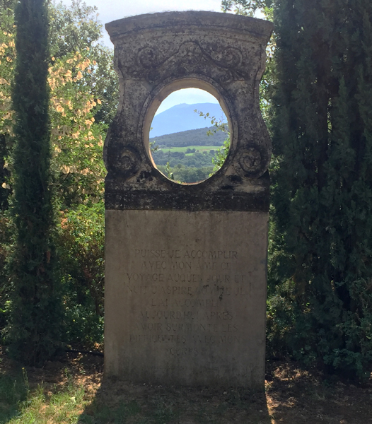 Turning back towards the chateau we came upon a peephole through which to view the Mont Ventoux. Below are carved Petrarch’s words describing his ascent to the summit on 13th April 1336 to see the sunrise: the first known account of walking simply for pleasure.