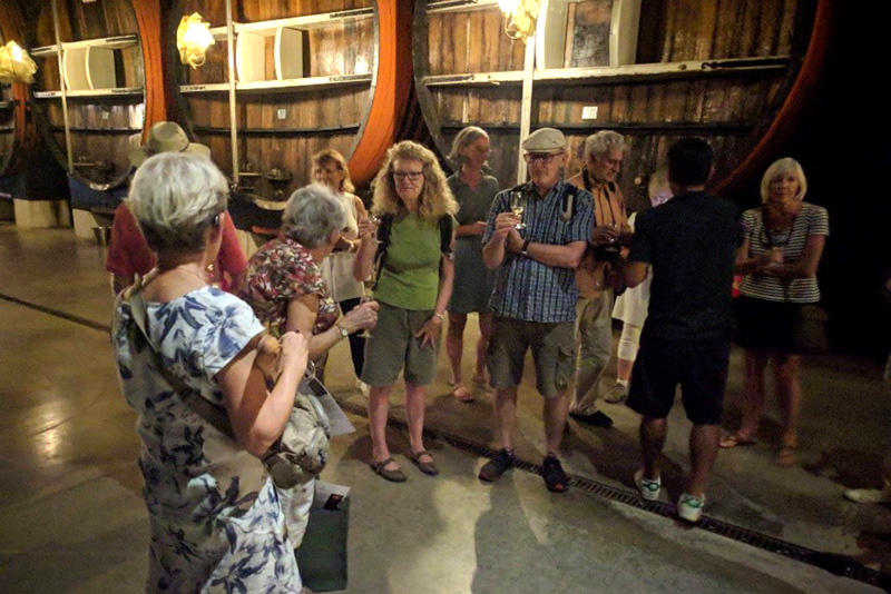 This was our first tasting stop. The muscat has its fermentation stopped by the addition of a neutral spirit made from sugar beet. Hence it has a very high level of residual sugar. This wine/spirit combination is called a mistelle and is aged in enormous Canadian oak barrels for around a year. It tastes like it sounds – a wonderfully sweet and fruity muscat with a slap on the back of the head from the beet spirit.
