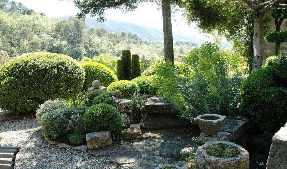 Les jardins de Nicole de Vésian à Bonnieux et d’Olivier Filippi à Mèze ont influencé le style de jardinage de nos membres. Nicole de Vésian avait bien sûr le sens du design ; elle était, après tout, designer chez Hermès. Elle a commencé son jardin au début des années 1980. Il est devenu un jardin méditerranéen unique et emblématique. Les formes contrastées de buis taillé, de genévrier, de romarin, de sauge et de lavande, ainsi que sa plante emblématique, le cyprès à sommet plat, ont inspiré les jardiniers depuis lors. L’ombre et les formes sombres dominent le jardin, surtout sous le soleil intense du Vaucluse.