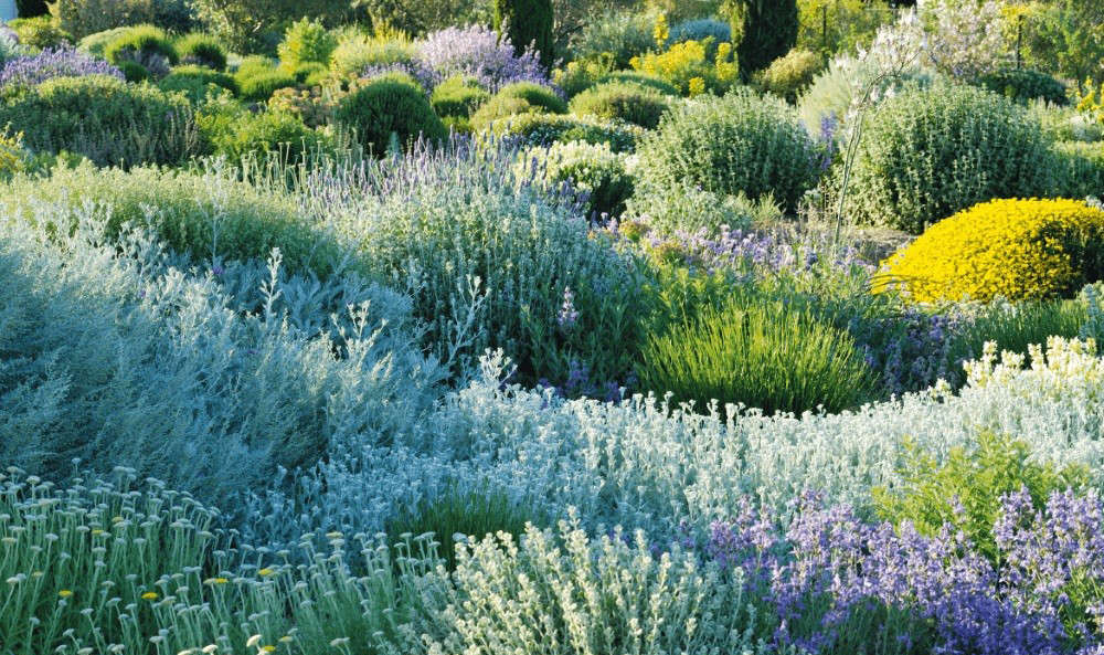 This photograph illustrates the ’natural’ style of a typical Filippi-style garden with lightly clipped boules, cushions, and carpets, including lavenders, rosemary, achillea, cistus, phlomis, helichrysum, oregano and euphorbia.