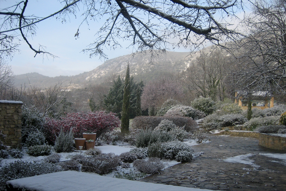 Le même jardin en hiver, dont la structure est assurée par des formes fortes et contrastées.