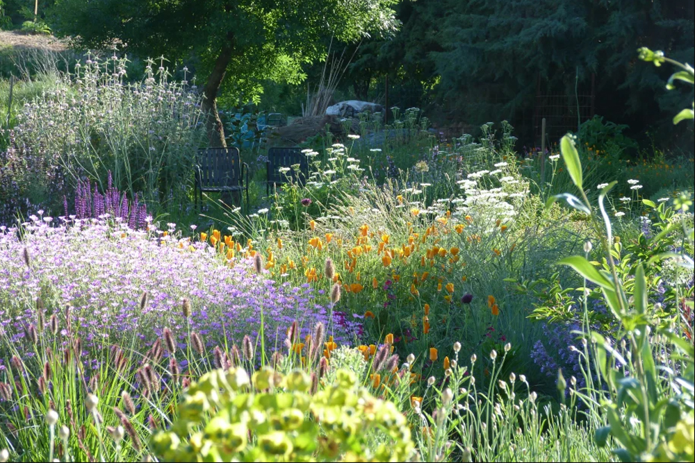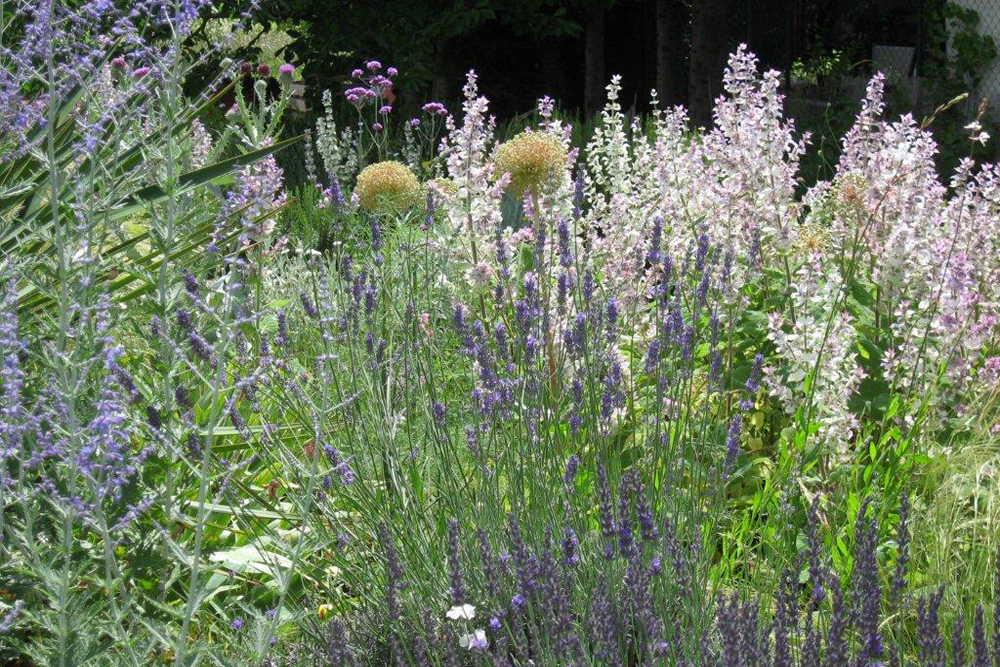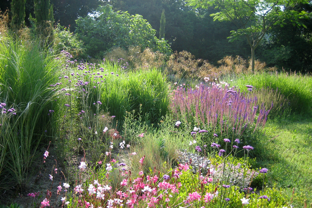 Une partie moins structurée du jardin comprend gauras, Stipa barbata, miscanthus et Salvia nemorosa.