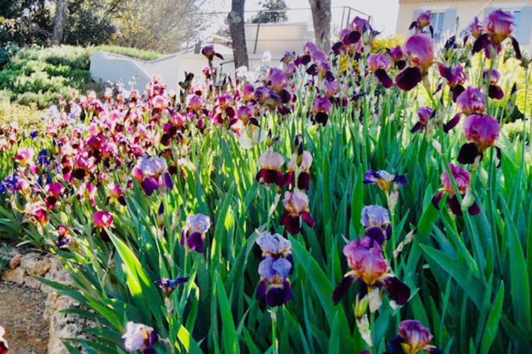 Iris germanica apporte de la couleur dans un autre jardin du Vaucluse. Un aspect différent, avec des couleurs plus douces, pourrait être obtenu en utilisant Iris lutescens, l’iris de la garrigue.