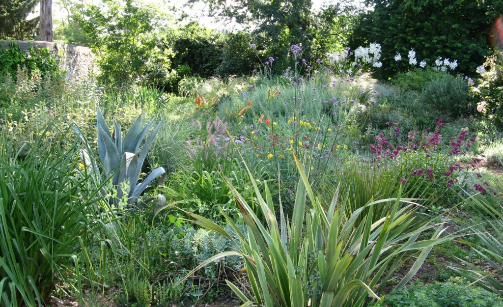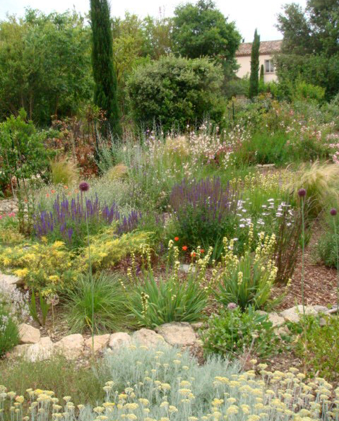 Les jardins aménagés par Clara et Olivier Filippi sont informels et presque tout à fait le contraire de ceux de Nicole de Vésian. Leur jardin de démonstration à Mèze et la sélection de plantes méditerranéennes prêtes à l’emploi dans leur pépinière ont inspiré le style de jardinage de nos membres. L’enthousiasme évangélique d’Olivier, ses livres et ses conférences en français et en anglais nous ont énormément motivés. Olivier aime souligner la folie d’essayer d’adopter dans le bassin méditerranéen des méthodes de jardinage traditionnelles de climat tempéré. Il propose des « Alternatives au gazon », des alternatives oui, mais pas des substituts. Pour réussir, il nous conseille de profiter des saisons et de la dormance estivale, de planter avec les pluies d’automne, d’expérimenter les couvre-sols, les prairies sèches et les plantes de garrigue. Et nous avons bien suivi ses conseils.