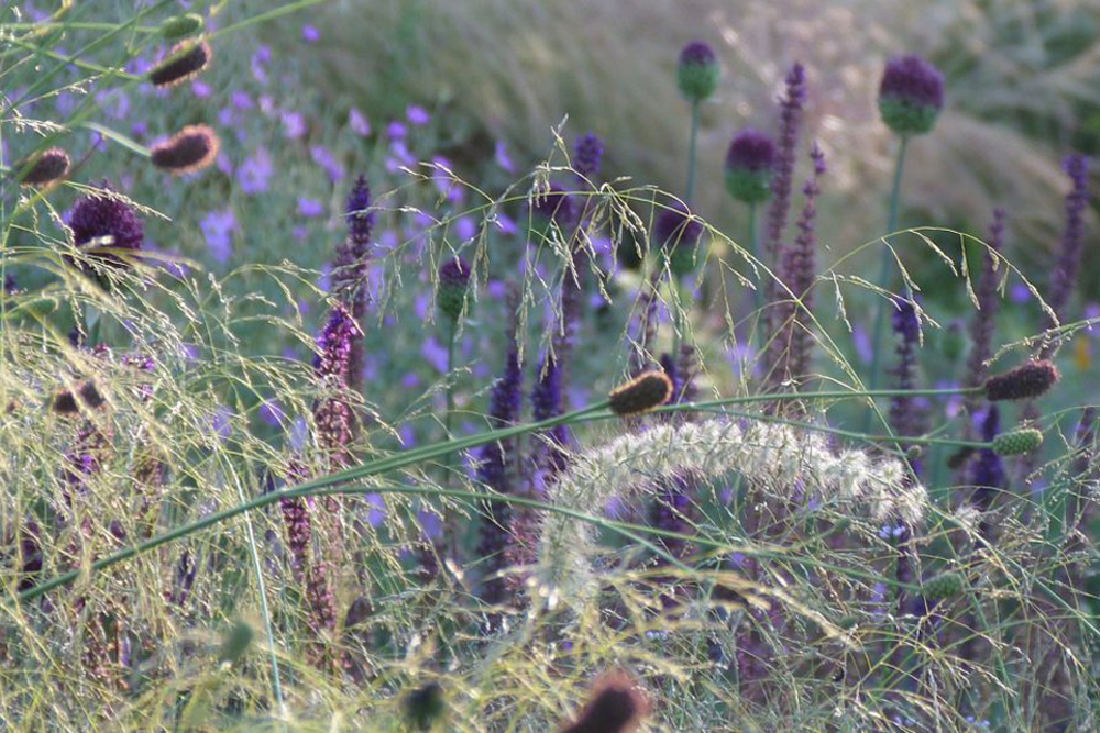 A less structured part of the garden includes gaura, Stipa barbata, miscanthus and Salvia nemorosa.