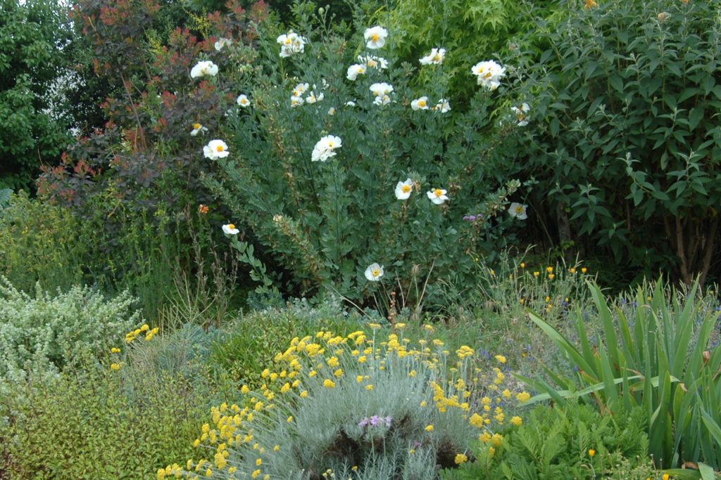 The gardens laid out by Clara and Olivier Filippi are informal and almost the exact opposite to those of Nicole de Vésian. Their demonstration garden in Mèze and the selection of ready-to-use Mediterranean plants from their pépinière, have inspired members’ garden style. Olivier’s evangelical enthusiasm, and his books and lectures in both French and English are major drivers. Olivier loves to point out the folly of trying to adopt traditional temperate style gardening methods in the Mediterranean Basin. He proposes “Alternatives au gazon”, alternatives yes, but not substitutes. To succeed, he tells us to embrace the seasons and summer dormancy, to plant with the autumn rains, to use ‘couvre-sols’, dry meadows and the plants of the garrigue. And we have followed his advice.