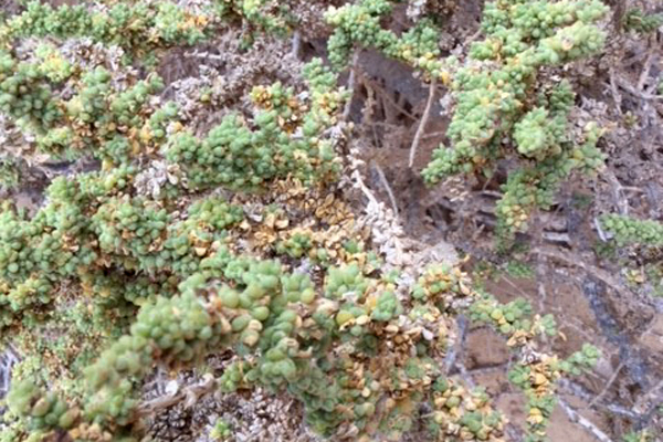 Tetraena fontanesii, la fabagelle des Canaries, pousse sur la côte dans des conditions très salées. Elle pousse dans un environnement identique et se comporte de la même manière que Sedum album qui est commun dans la garrigue.