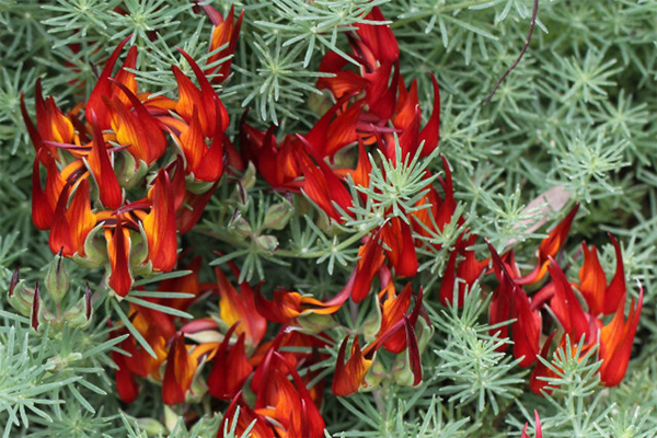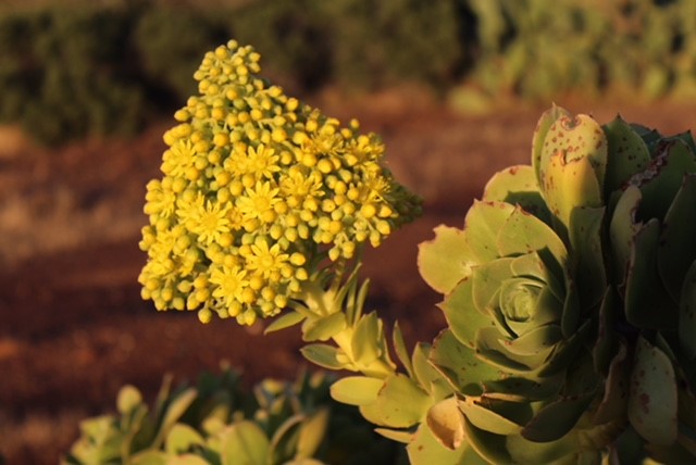 The spurges, Euphorbia species, also grow into remarkable shapes. Some are cactus-like, others leafless succulents, some small shrubs and some small trees. They grow in dry, arid niches. Then there are the houseleeks, Aeonium species, all endemic to the Canary Islands. Last but not least are the low growing Lotus species. Lotus berthelotii is a classic Canary Islands plant with bright red claw-like flowers and grey foliage. Today it is used in hanging baskets. It is probably extinct in the wild